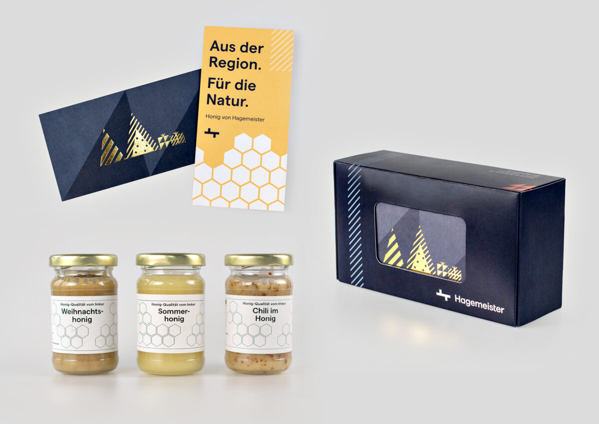 Für Hagemeister entwickelten wir das Packaging eines hochwertigen Honigs als Weihnachtsgeschenk. Eine besondere Herausforderung: Die Etiketten mussten im Thermodruckverfahren produziert werden – mit stark begrenzten gestalterischen Möglichkeiten. Statt das zu kaschieren, haben wir den Fokus bewusst verlagert. Über Verpackung und Karte entstand ein reduziertes, wertiges Gesamtkonzept, das Materialität, Handwerk und Haltung von Hagemeister aufgreift.
